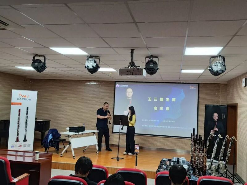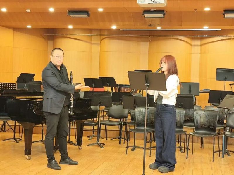 同日下午,王云磊老师在中国人民大学艺术学院作了题为《新疆音乐之单簧管创新演绎》的专题讲座。讲座聚焦单簧管演奏技法与教学体系构建,融入中华多民族音乐元素,尤其以新疆音乐为案例,探索了单簧管在跨文化语境中的艺术表达路径,激发了师生对音乐融合与创新的广泛思考。