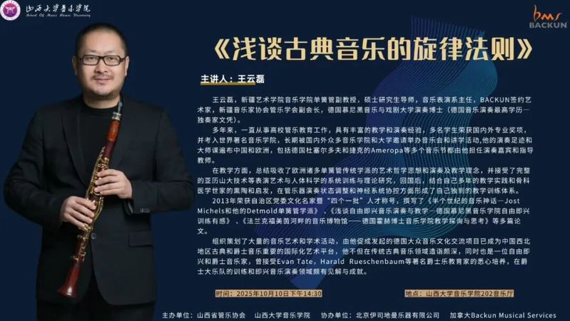 10月10日至11日,王云磊副教授应邀赴山西大学举办学术讲座,主题为《浅谈古典音乐旋律法则》。他系统解析了古典音乐旋律的构成逻辑与美学特征,为现场师生带来深刻启发,拓宽了大家对音乐形态与表现方式的认知。