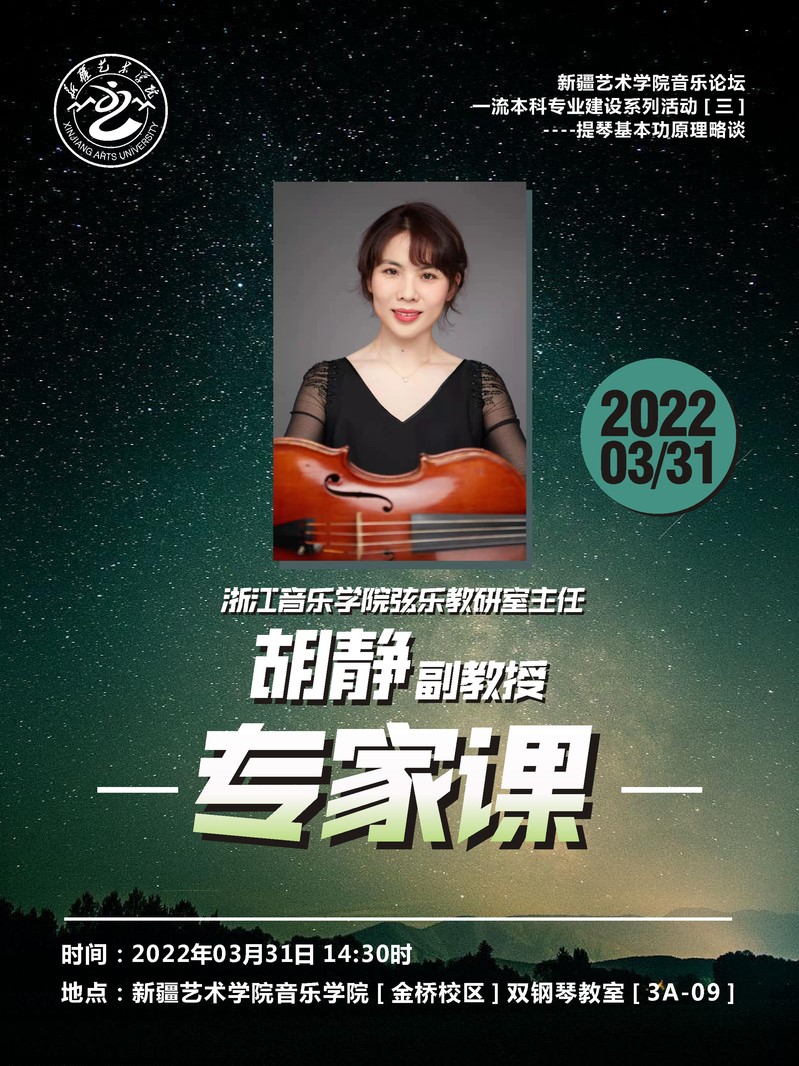 3月31日中午14:30时,浙江音乐学院弦乐教研室主任胡静副教授以《提琴基本功原理略谈》为题,拉开了新疆艺术学院音乐论坛一流本科专业建设系列活动第3场的序幕,为音乐学院在场师生们带来了一席提琴知识的饕餮盛宴。