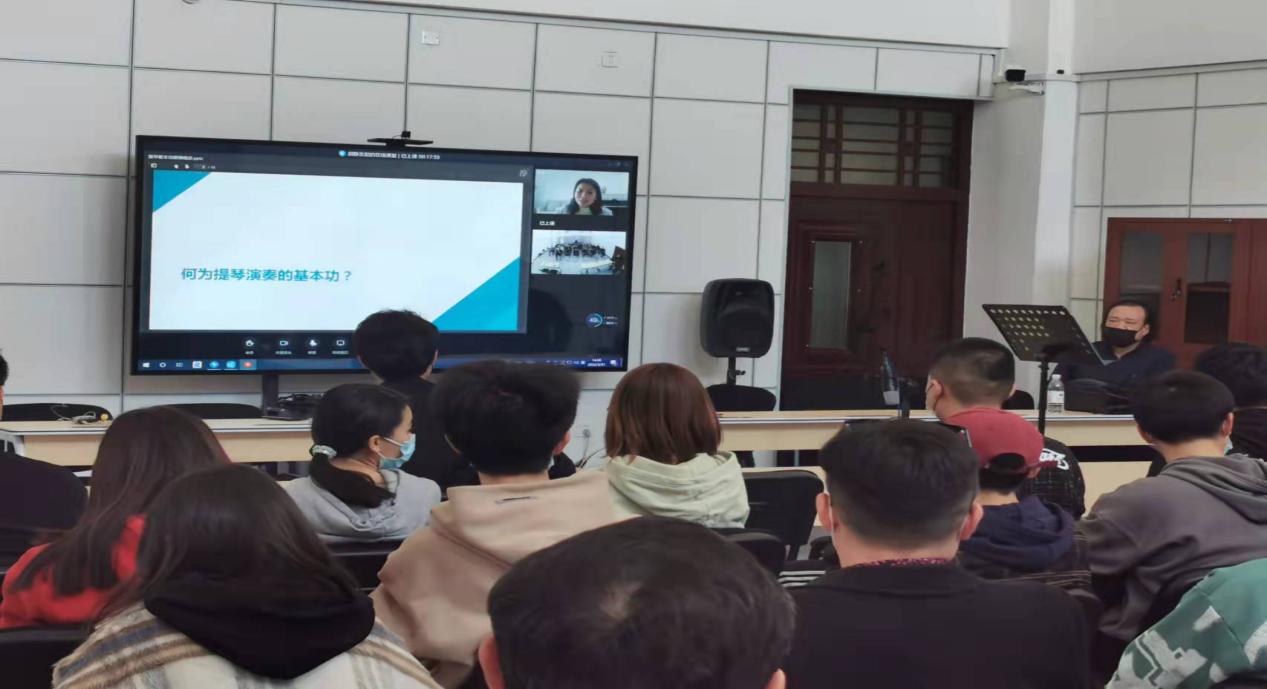 本次讲座在音乐学院双钢琴排练厅3A-09以“线上+线下”相结合的形式进行,吸引了众多师生到场聆听。胡静副教授此次讲座主要分为三部分,首先为大家介绍了弦乐器基本功的类型,她指出:“基本功在乐曲中的运用,就像是器官之间密不可分”。其次,胡静副教授为大家讲解了演奏小提琴/中提琴时的几组绝对关系以及拉小提琴时的方式方法等。最后,在胡静老师主讲结束后,与同学们进行了短暂而热烈的讨论与互动。特别是为音乐学院2019级小提琴演奏方向学生---玛丽祖亚讲解了乐曲在复调方面的相关知识,该生表示:“听完胡老师的讲座后感觉醍醐灌顶、受益匪浅,这样的大师课是提升个人专业能力的好机会,希望今后学院能邀请更多的专家为我们讲课。”