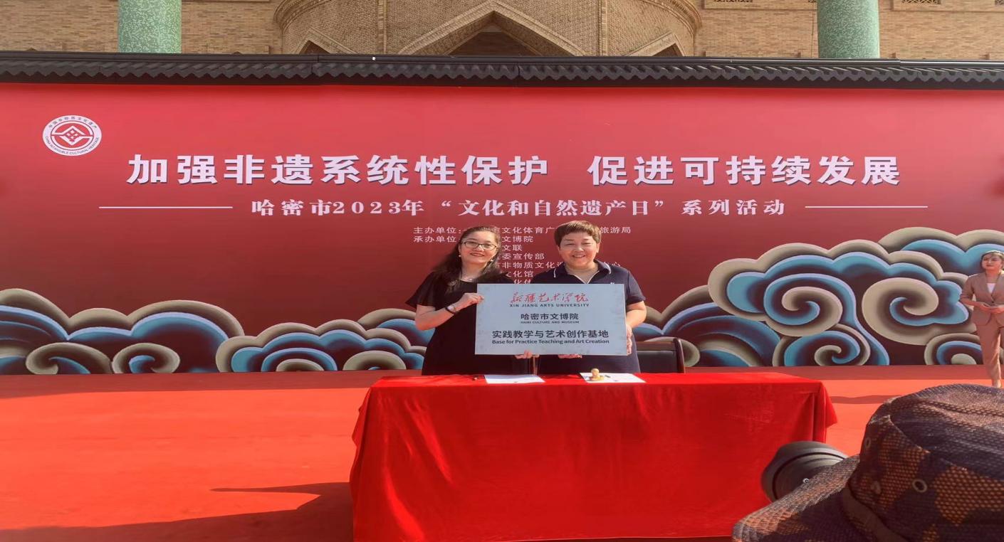 2023年6月10日,新疆艺术学院受邀参加哈密市文化体育广播电视和旅游局、哈密市文博院、哈密市文化馆主办的2023年哈密市“文化和自然遗产日”系列活动。在本次活动开幕式上新疆艺术学院与哈密文博院举行了实验教学基地的授牌与签订建立校馆合作仪式。