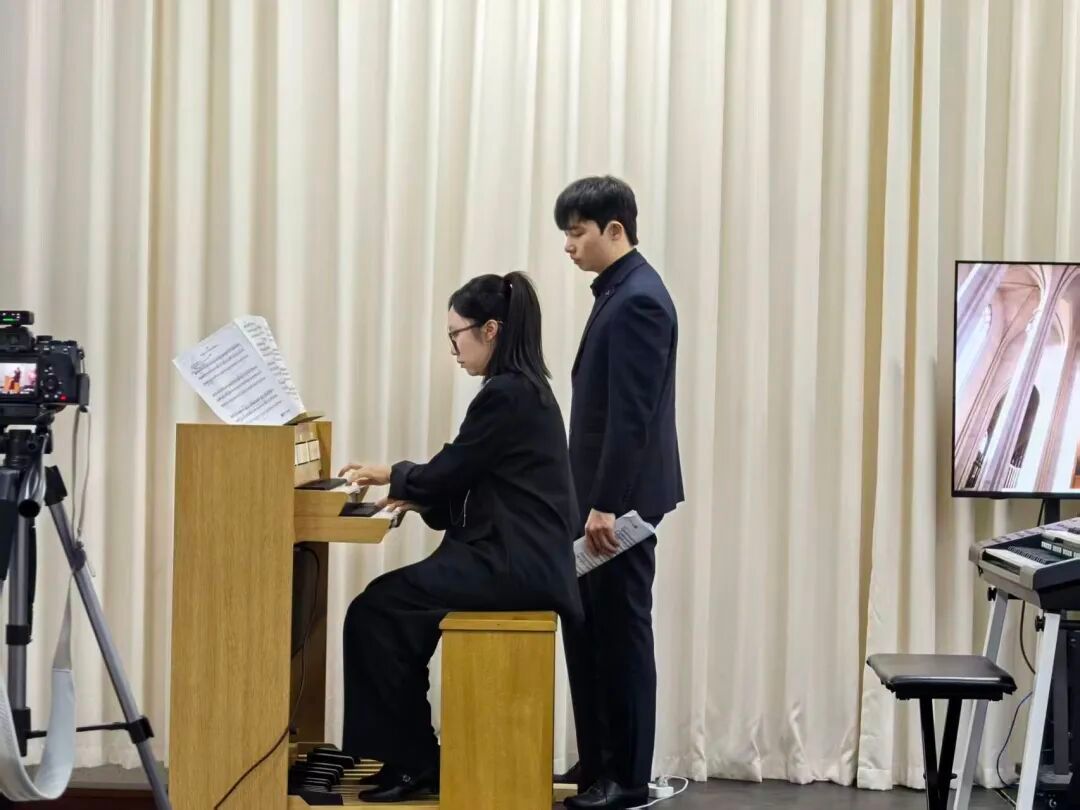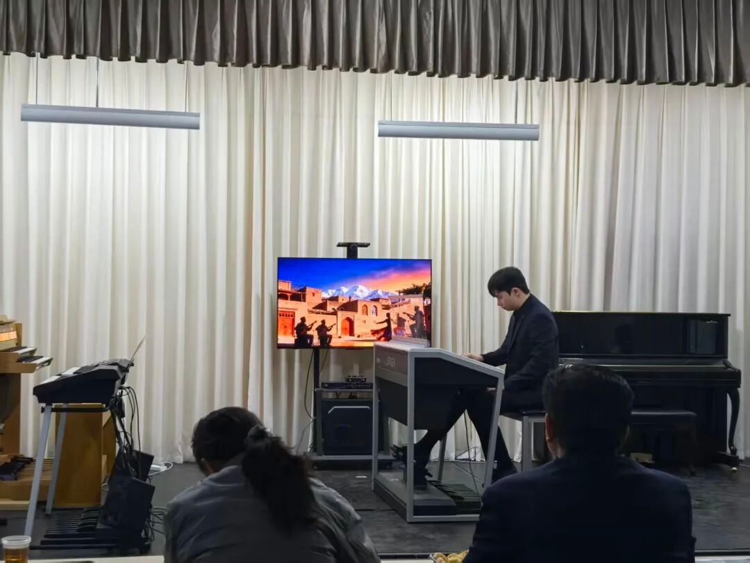 整场演出以“音之经纬”为主题,通过管风琴与电子管风琴的现场对话,将思想政治教育、音乐历史叙事与舞台艺术实践实现无缝衔接。在“时间经线”上,巴赫《C大调前奏曲》与亨德尔《皇家焰火之小步舞曲》共同呈现出巴洛克音乐的艺术内核;李斯特《BACH主题前奏曲与赋格》以浪漫主义音乐语言重释经典;波尔曼《哥特组曲》则勾勒出法兰西民族音画。在“文化纬线”上,电子管风琴拓展了思政育人的维度。学生改编演奏的努斯来提·瓦吉丁《喀什噶尔随想曲》融入都塔尔弹拨韵律与手鼓节奏,以民族调式结合西方和声,呈现出喀什地域民俗风貌;作曲家洼田宏的《Funky D Town》以放克(Funk)节奏点燃现场氛围。