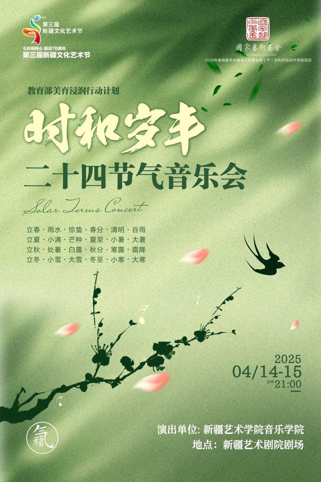 4月7日,“七彩铸同心・喜迎七十周年”第三届新疆文化艺术节开幕。新疆艺术学院52件文艺作品将在系列展览中展出,其中,音乐会《时和岁丰——二十四节气主题音乐会》将作为主会场演出精彩上演。敬请关注!