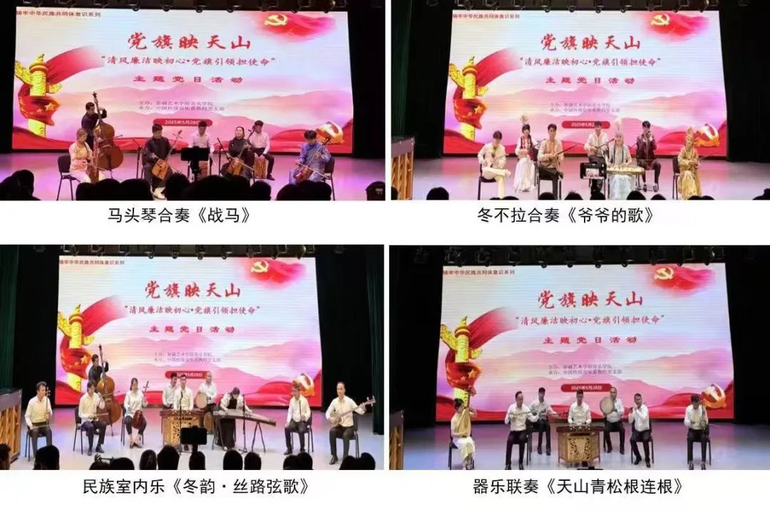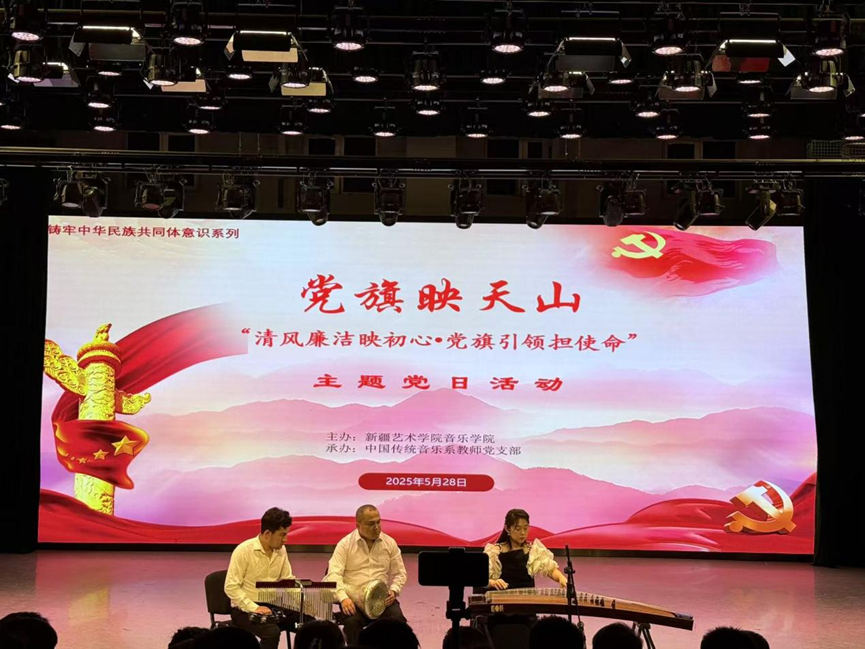 5月28日,音乐学院中国传统音乐系教师党支部在舞蹈学院小剧场举办了“党旗映天山——清风廉洁映初心・党旗引领担使命”主题党日活动。音乐学院领导班子、各支部书记、乌鲁木齐经开区祥云社区党总支、特警五支队七大队、新疆艺术学院纪委党支部、教务处党支部、后勤党总支、保卫处党总支、音乐学院全体教职工及部分学生党员代表参加活动。